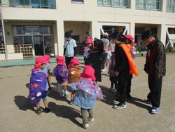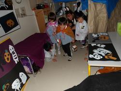 4歳児クラスの子どもたちは、夏にコツコツと作ってきたお化けの人形を使い、お化け屋敷をオープン!入ってくるお客さんに合わせて「ちっちゃい子は怖がるから、追いかけるのはやめとこ」「先生が入ってきたときには思いきり怖いお化けに変身しよな!」とお化けの怖さを調節しながら、みんなを楽しませてくれました。年長さんに向けて、小さい子への配慮ができる頼もしいお兄さんお姉さんになってきた4歳児なのでした。