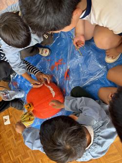 また、小学校の先生に白いカボチャをいただきました。年長さんが代表して色付けをし、可愛い顔と飾りをつけて、ハロウィンのカボチャに変身!こども園にも飾りました。ありがとうございました!!