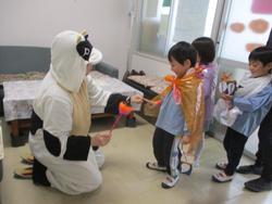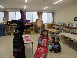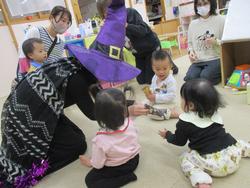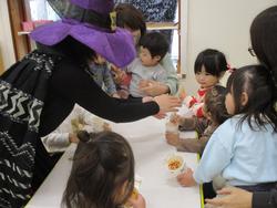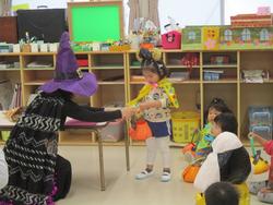 こども園でもハロウィンを楽しみました。「トリックオアトリート!!」魔女さんのカードを引いて、そこに出たミッションに挑戦!出来たらお菓子をゲット!みんなミッションを楽しんでいました。牛さんにもお菓子をもらって大喜びでした♪