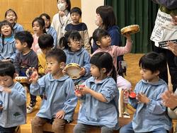 「サンタさんにこども園の場所を知らせよう!」クリスマスソングに合わせて、鈴やカスタネットなどを鳴らしていると…