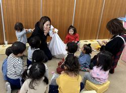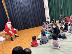 遊戯室の外から鈴の音が聴こえてきました。こども園にサンタクロースがやってきてくれたのです。サンタクロースの登場に子どもたちの目はキラキラ✨✨赤ちゃんは赤い大きなおじいさんにびっくりしていましたが、先生に抱っこされながら、「この人は悪い人ではないかも…」とじぃ~っと見ていました。