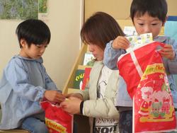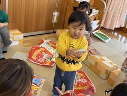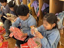 先生にお部屋でプレゼントを配ってもらい、わくわくしながらプレゼントを見る子どもたち。「やった~~!!」大喜びで「サンタさん、ありがとう!!」口々にお礼を言っていました。よかったね♡