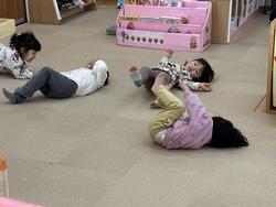 1歳児は絵本を見ながら歌を歌ったり、大好きなどんぐりになってころころ転がったりと全身で音楽リズムを楽しみました。どんぐりの歌が始まると、「どんちゃん…(どんぐりのこと)」小さな手に大事に握りこんだどんぐりを見ている子もいました。秋にどんぐりと出会い、すっかり仲良くなった子どもたち。どんぐり大好き!の気持ちが伝わってきました(≧▽≦)