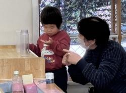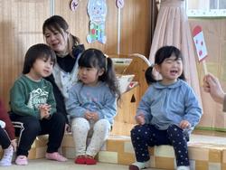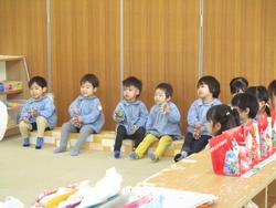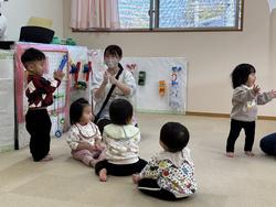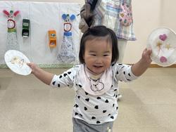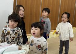 2歳児になると、さすがお兄さんお姉さんになってきているのが、感じられます。椅子に座って、お返事に合わせて「は・あ・い!!」とタンバリンを鳴らしたり、大好きな歌「どんな色がすき」や「はたらくくるま」などちょっと難しい歌詞の歌をとてもいい笑顔で歌ったりしていました。もうすぐ幼児クラスになるんだなと感じました。
