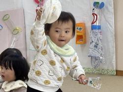 0歳児は絵本を見ながら手遊びを楽しんだり、楽器を鳴らしたりと毎日の生活の中で音楽にふれてきました。自分で選んだ手作り楽器を持ち、音楽に合わせて自然に体が動いている子どもたち。手作り楽器が大好きで、いっぱい持ちたくて、片手にマラカス、片手にタンバリン3個を抱えている子もいれば、びっくりするくらいリズミカルな動きをしている子もいます。楽しみ方はさまざまです!