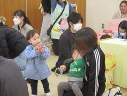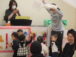 幼児組のおにいさん、おねえさんから刺激を受けたり、自分たちの大好きな歌や楽器に触れて遊んだり、体を使って音に合わせて動くことを楽しんだり、その年齢に応じた自然な音楽あそびを楽しんでいるところを保護者の方にみていただきました。うれしいことに0歳児の保護者の方は、スマホを置いて子どもたちと一緒に経験することを優先してくださっていました。一緒に楽しもうという気持ちがとっても嬉しい時間でした。