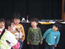楽器を使ったペープサートは、みんなの大好きな『3びきのこぶた』でした。ぶたたちが家を作る場面では「がんばれ~!がんばれ~!」と応援の声が…。おおかみさんが出てくるところはハラハラドキドキ!そして、あれ?中ぶたちゃんの声に聞き覚えが…。園長先生だ!