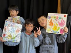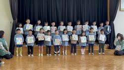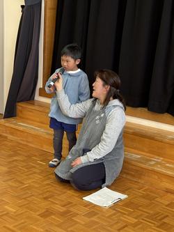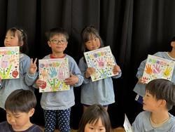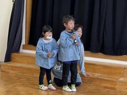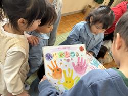 「年長さんは目をつぶってください」目をつぶっている間に、ほかの子どもたちはみんなで協力して作ったプレゼントを用意。手形のお花やありがとうの文字、素敵な模様などみんなの気持ちを込めて作った色紙を「年長さん、ありがとう!!」と手渡しました。これには年長さんもにっこり笑顔!最後は年長さんがお礼にと「ずっといっしょ」という歌を歌ってくれました。「今日(お別れ会)どうでしたか?」と4歳児がマイクで尋ねると、「楽しかったです」と嬉しそうな子どもたちでした。