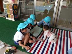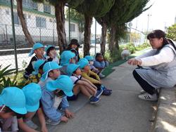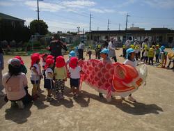 年長さんは誰がどの鯉のぼりを持つか、どうやって小さいクラスの子たちに鯉のぼりを紹介し、鯉あげ式を進めていくのかを話し合い、マイク係・鯉のぼりを持つ係と役割分担。自分たちで考えて進めていく姿が頼もしい!!「吹き流しです。吹き流しは悪いものをやっつけてくれます!」「真鯉です」「緋鯉です」「子鯉のあおちゃんです」「みどりくんです」「にじいろちゃんです」と教えてくれました。「触ってもいいですよ~」全部のクラス、すべての友だちが鯉のぼりに触れているか、考えながら回ってくれました。そして乳児さんたちのペースに合わせて、みんなが心ゆくまで鯉のぼりに触れるように、待ってくれたのでした!