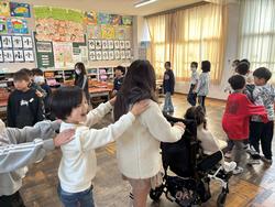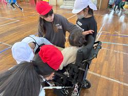 曲に合わせて友だちとつながって歩きました。紅白オセロの盛り上がりも友だちの近くで感じました。