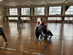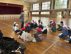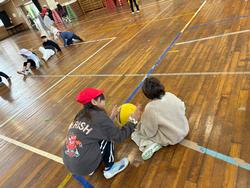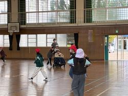 2時間目は、1組の児童と体育館で「歩きおにごっこ」と「転がしドッジボール」をしました。