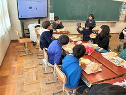 5年2組で給食を食べました。友だちと「イェーイ」と言いながら写真を撮りました。